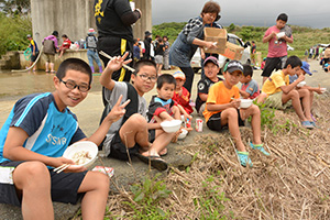 集まった子どもたちは、まだ水の冷たい水田へ大きな歓声を上げながら素足を入水。多くの子どもたちは慣れない田植えに、大人に教えてもらいながら作業を進めていきました。井之川夏目踊り保存会の田植え歌に合わせて、6アールの水田への田植えで心地よい汗を流しました。作業後は、昨年収穫した米で作ったドゥシバン(おかゆ)が振る舞われ、ツワブキや豚のアバラ肉の入った粥をみんなで味わいました。