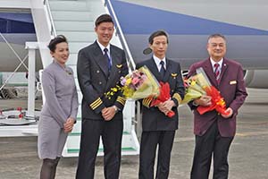 花束を贈呈されたチャイナエアラインの乗務員ら