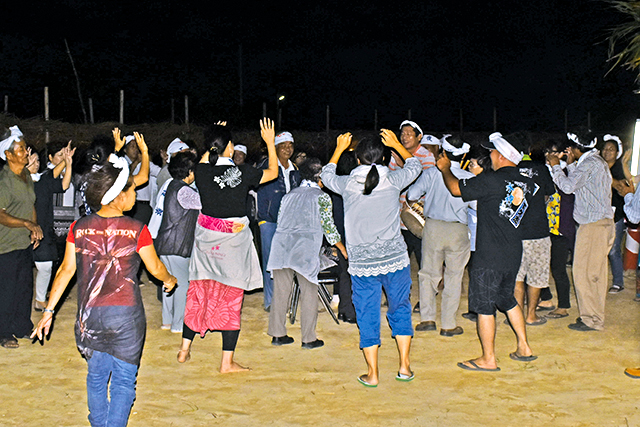 恒例の相撲や島唄、力石を持ち上げる「ハンタ石かつぎ」、新生児の健やかな成長を祈る「ミイバマクマシ(新浜踏まし)」などが行われ、祭りの夜を楽しみました。