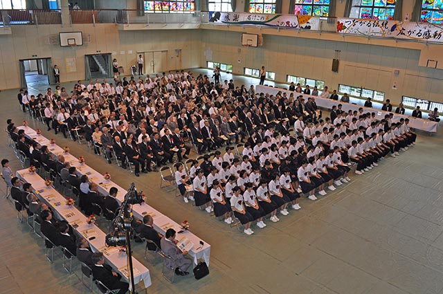 式典で、桑畑明斉校長は校舎完成までの経緯を振り返った上で、「新校舎落成までの期間の取り組みで、生徒には忍耐と感謝が生まれ、地域住民との一体感が育まれました。生徒と教職員、保護者が一体となって、亀津中学校の教育にまい進してまいります」とあいさつ。生徒代表の伊宝那美香さん(3年)が「旧校舎の思い出は、最後の体育大会を経験したことです。今後、10年、20年と後輩たちに引き継がれるよう、新校舎にふさわしい生徒になり、立派な亀津中学校になるように精進していきます」と誓いました。高岡秀規町長は、「学力向上へ向けては、関係者の方々と町当局が支援体制を組みながら、立派な生徒を育てていきたい」と激励。教育長、歴代学校長代表の祝辞に続いて、功労者に表彰状が授与されました。