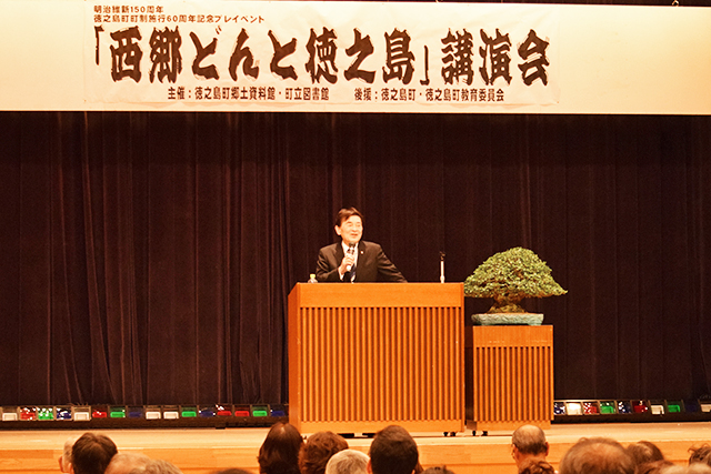 12月2日、徳之島町生涯学習センターで「西郷どんと徳之島~徳之島の家族愛~」原口泉氏講演会(徳之島町郷土資料館・同町立図書館主催)が開催されました。鹿児島県立図書館館長で2018年の大河ドラマ「西郷どん」の時代考証を担当している原口氏。講演では、西郷が徳之島にいたころに世話をした琉仲為の息子で、西郷に同伴して京都で病死した琉仲祐の話など、より歴史を身近に感じられる内容を展開。満員となった会場で、聴衆は軽妙な語り口に熱心に耳を傾けていました。